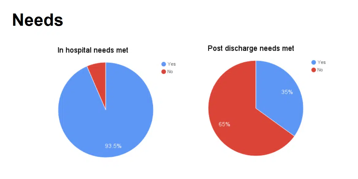 The first results I showed were to 2 questions as to whether people had felt their needs had been met in hospital and post discharge.  Unsurprisingly most responded positively for in hospital – after all they’re alive!  But in stark contrast nearly two thirds thought their needs were not met once they had left the hospital.Â