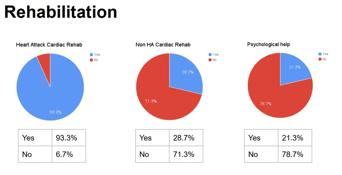 When I was discharged I got no rehab offered and I thought that was probably the case for most others. Â I could of done with some, although maybe not in the same sense as someone who had had a heart attack or major surgery. Â So, I asked whether the groups members got any rehab or psychological help. Â With regards to the rehab responses, I noticed a trend that those who had a heart attack as a causal factor to their SCA tended to get rehab, where those who did not, didn’t. Â So I split the results out to show as such. Â It was also fairly noticeable that only 1 in 5 got any psychological help.